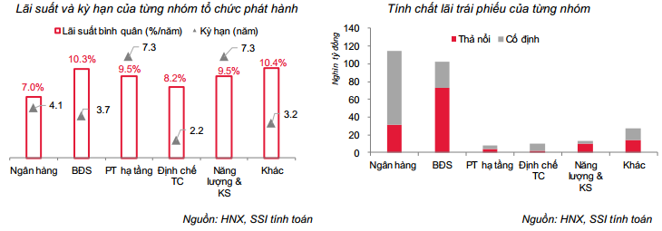 Có 51,3% trái phiếu phát hành có lãi suất cố định, tập trung chủ yếu vào các trái phiếu kỳ hạn 2-3 năm của nhóm NHTM, trả lãi định kỳ hàng năm. 48,7% trái phiếu còn lại có lãi suất thả nổi, chủ yếu là trái phiếu các doanh nghiệp BĐS và trái phiếu ngân hàng kỳ hạn từ 5 năm trở lên.