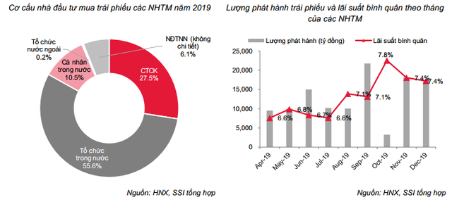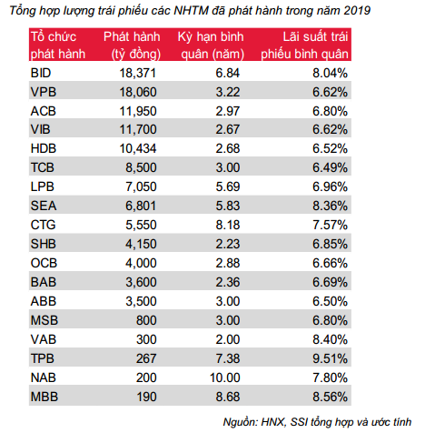Về bình quân gia quyền theo giá trị phát hành năm 2019, lãi suất trái phiếu trung bình toàn thị trường là 8,8%/năm và kỳ hạn trái phiếu bình quân là 4,04 năm. Lãi suất và kỳ hạn đều nhích tăng trong quý cuối năm phần nhiều do các NHTM gia tăng phát hành trái phiếu kỳ hạn dài và lãi suất cũng cao hơn, ghi nhận bởi SSI Research.