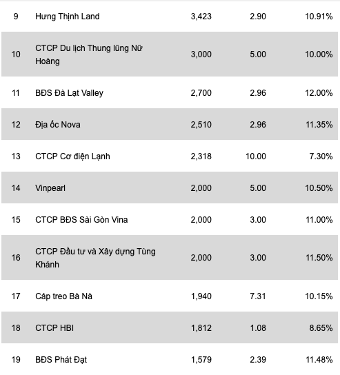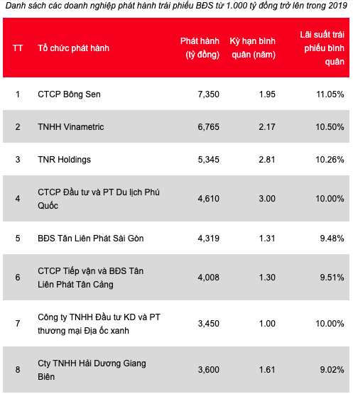 Tổng lượng trái phiếu bất động sản phát hành năm 2019 là 106.5 nghìn tỷ đồng, chiếm 38% tổng phát hành toàn thị trường và chỉ xếp sau nhóm ngân hàng. Kỳ hạn bình quân của nhóm này là 3,7 năm và lãi suất bình quân là 10,3%/năm – cao nhất thị trường nếu loại trừ lô phát hành của Hồng Hoàng.