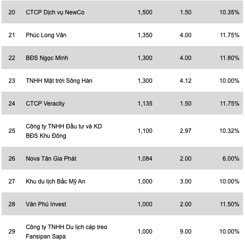Ngoại trừ nhóm trái phiếu ngân hàng, hầu hết các trái phiếu nằm trong khoảng lãi suất 10-11%/năm, tức là cao hơn lãi suất tiền gửi từ 3-4%/năm. Mức này cũng ngang bằng lãi suất cho vay trung và dài hạn đang là 9-11%/năm (theo thông tin từ NHNN).