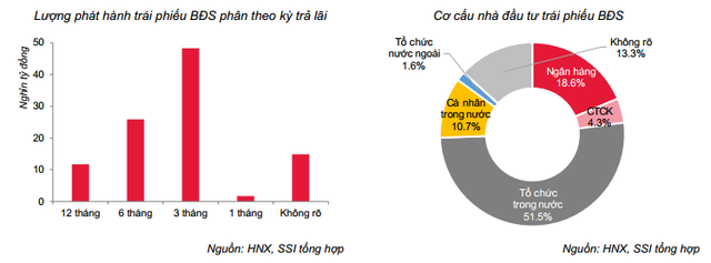 Tổng lượng trái phiếu bất động sản phát hành năm 2019 là 106.5 nghìn tỷ đồng, chiếm 38% tổng phát hành toàn thị trường và chỉ xếp sau nhóm ngân hàng (một số lô phát hành của các tổ chức đa ngành nghề nhưng mục đích sử dụng vốn là đầu tư BĐS nên vẫn được SSI Research xếp vào nhóm này). Kỳ hạn bình quân của nhóm này là 3,7 năm và lãi suất bình quân là 10,3%/năm – cao nhất thị trường nếu loại trừ lô phát hành của Hồng Hoàng.